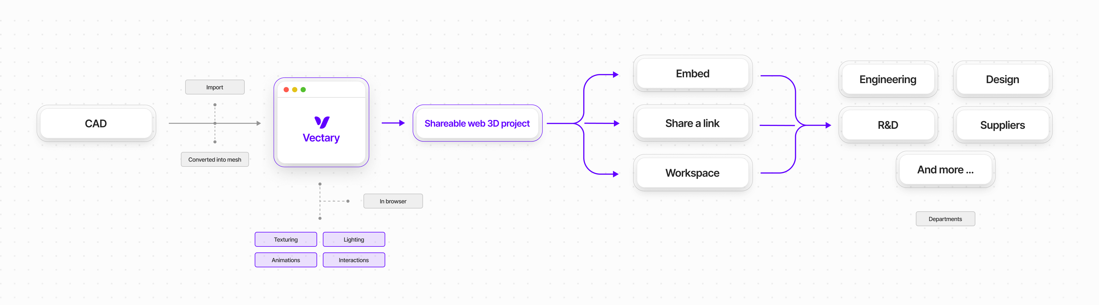 Vectary offers a professional 3D design studio, DAM and a browser-based 3D viewer that’s fast, flexible, and built for collaboration. It connects with the tools you already use, scales as your needs grow, and helps teams get all the benefits of working with enterprise-ready 3D assets.